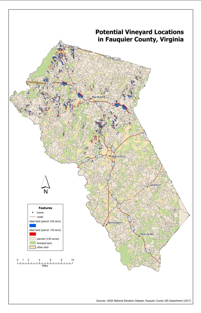 In this lab, I used raster analysis techniques to identify areas in Fauquier County, Virginia, that are most suitable for wine grape cultivation. This involved reading a synopsis of the literature on vineyard location in Virginia, developing a GIS model based on that literature, and then performing a series of raster analysis functions to determine which areas have the required location factors for a successful vineyard. This allowed me to identify suitable vineyard sites and determine whether they are within parcels with the requisite zoning and size to support a winery.