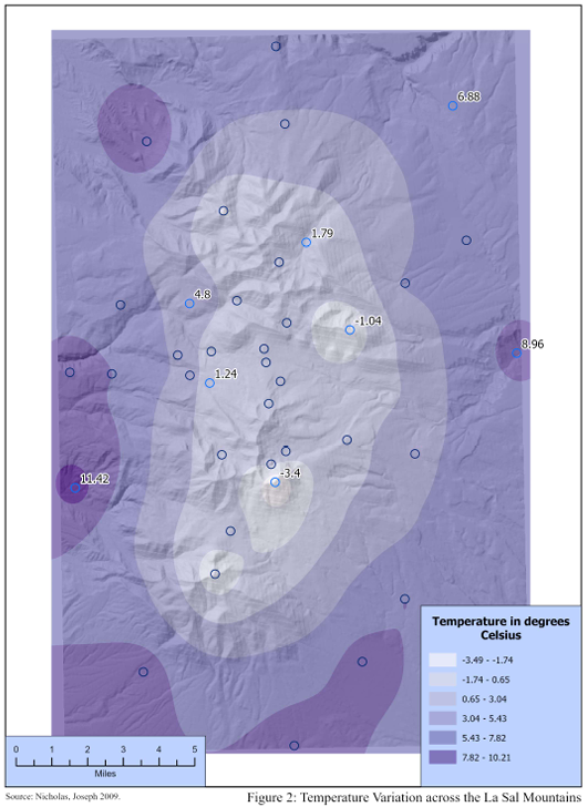 This lab had two purposes: 1) to create a raster GIS data model (ArcGRID floating point file format) of temperature variations across the La Sal Mountains of Utah and 2) to evaluate that model given what we know about interpolation and the known relationships between temperature and topographic variables like elevation, slope, and aspect. To do this, I used a variety of ArcGIS Spatial Analyst tools to better understand the topography of the study area before I created a raster data model of temperature using interpolation tools. I also learned to create a 3D map to help readers visualize the relationships between elevation and temperature as part of the evaluation of the raster model of temperature that I created.