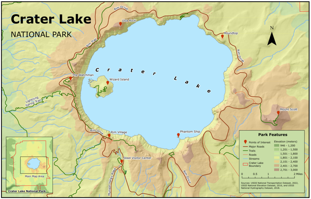 In this lab, I created a map of Crater Lake National Park in Oregon from a geodatabase that I assembled. The map emphasizes the most famous features of the portion of the park surrounding Crater Lake and uses elevation as background information. Creating this map required me to download data, use selection and classification to generalize the feature classes and raster datasets provided, and learn ArcGIS Pro layout tools to create the final map. I employed the design guidelines we covered in class, including the principles of planar organization, figure-ground relationships, symbol design, and typography.
