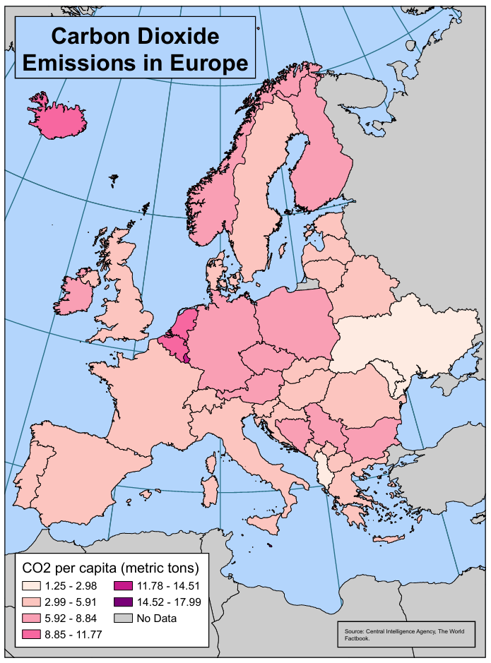In this lab, I created a choropleth map of CO2 emissions per capita by country in Europe as of 2022. To do this, I created a new geodatabase, applied what I had learned about working with attribute data, and learned to use the layout functions in ArcGIS Pro to create a map with a title, legend, and source information. Working with attribute data included preprocessing the data, calculating descriptive statistics, creating a simple frequency histogram, and using this information to choose and appropriate classification method for the map.